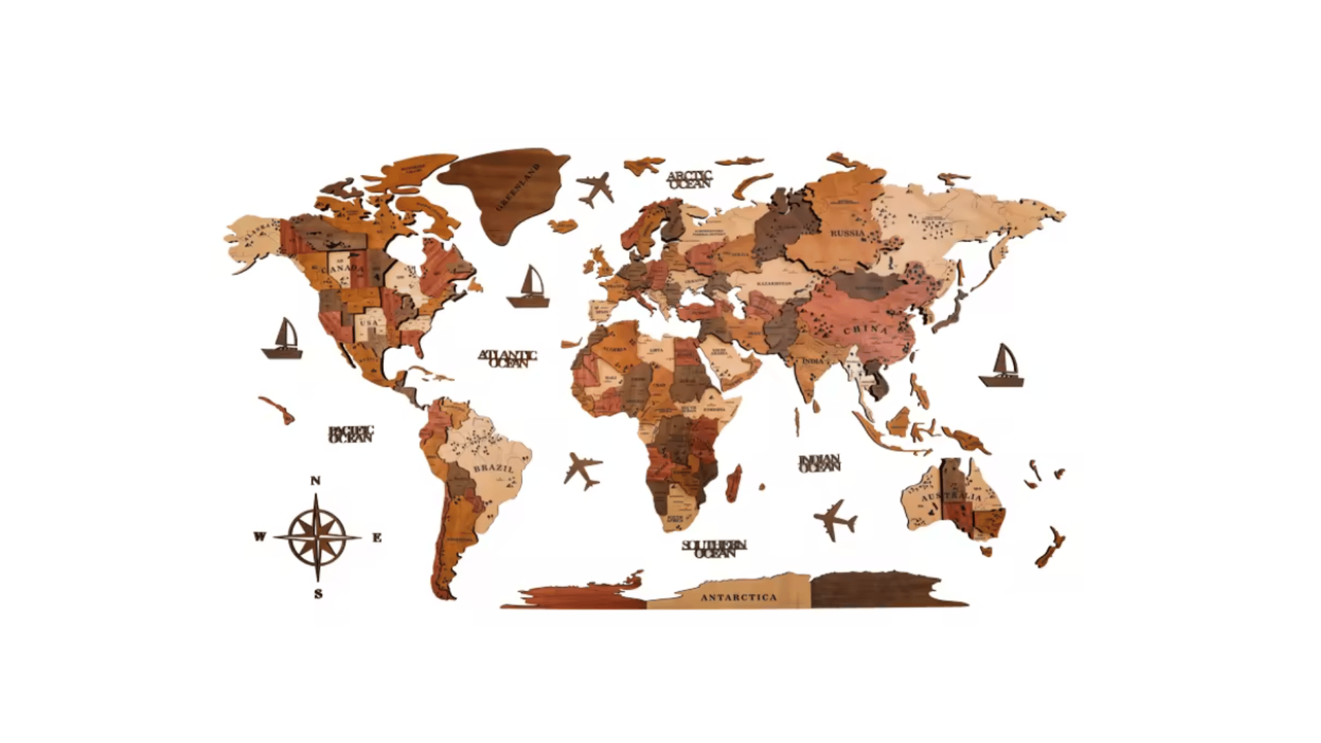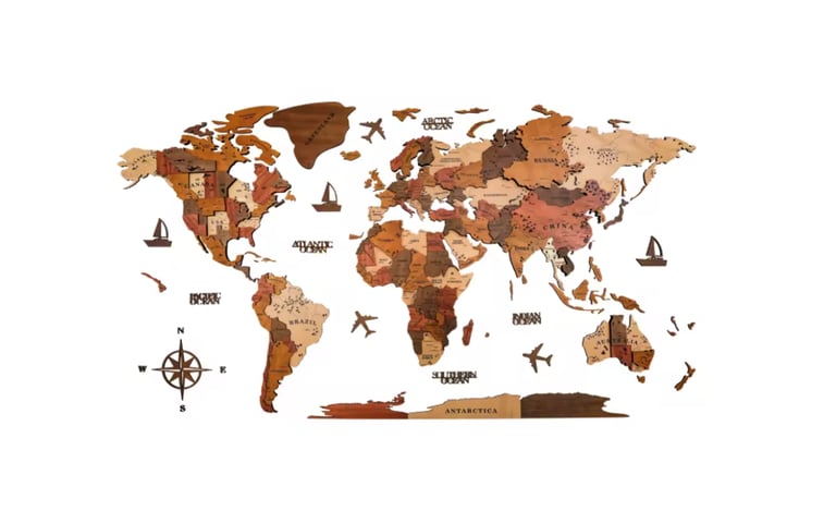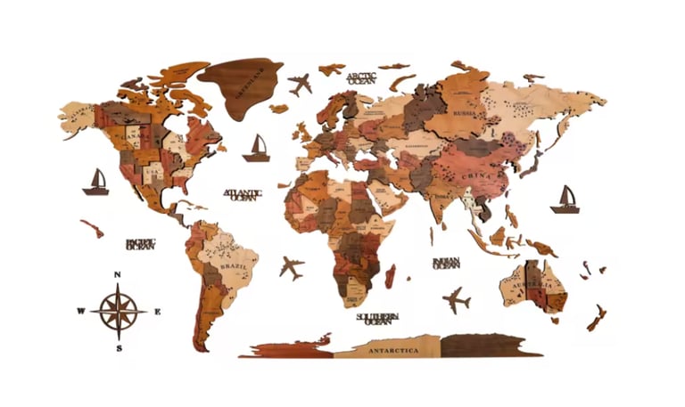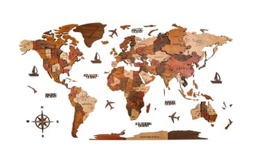 Dekoracyjne mapy świata wykonane ze sklejki lub korku, z możliwością dopasowania rozmiaru do indywidualnych potrzeb.