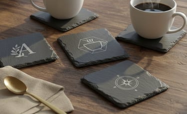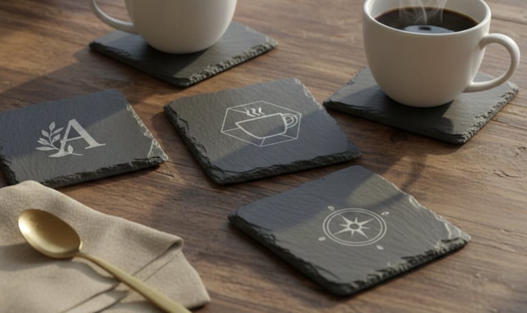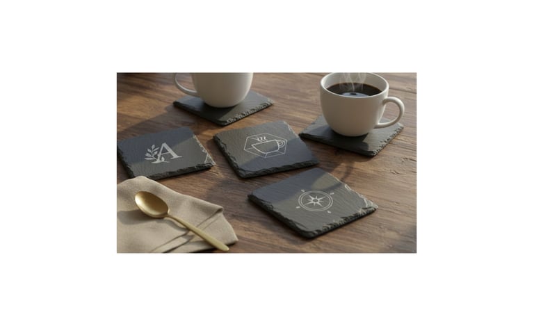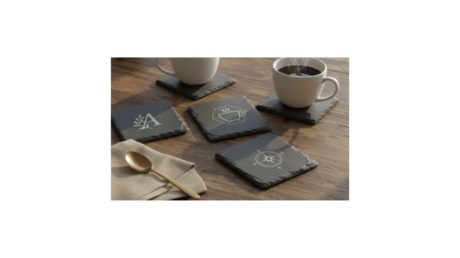 Podkładki z łupka z grawerem laserowym, przydatne w hotelach i restauracjach jako forma brandingu.