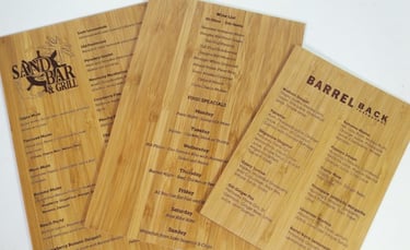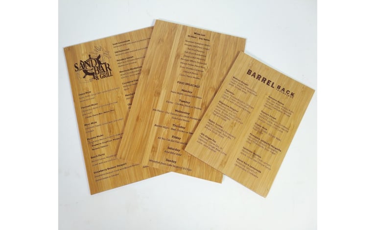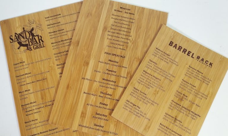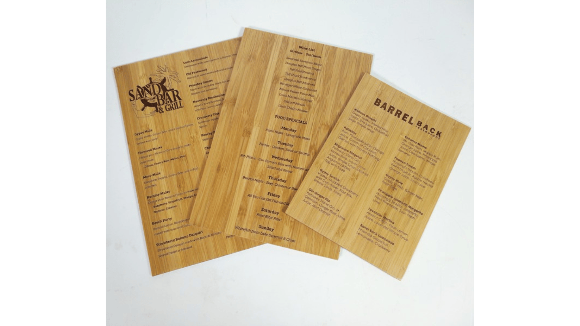Menu z drewna lub sklejki wycinane i grawerowane laserowo, w pełni personalizowane.